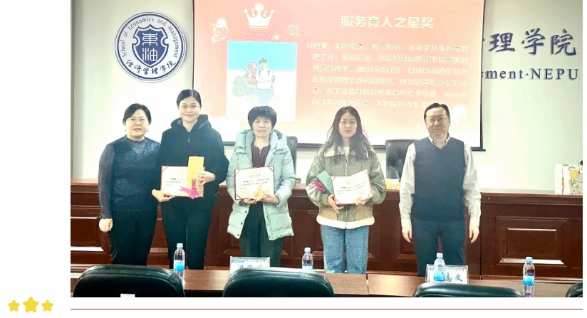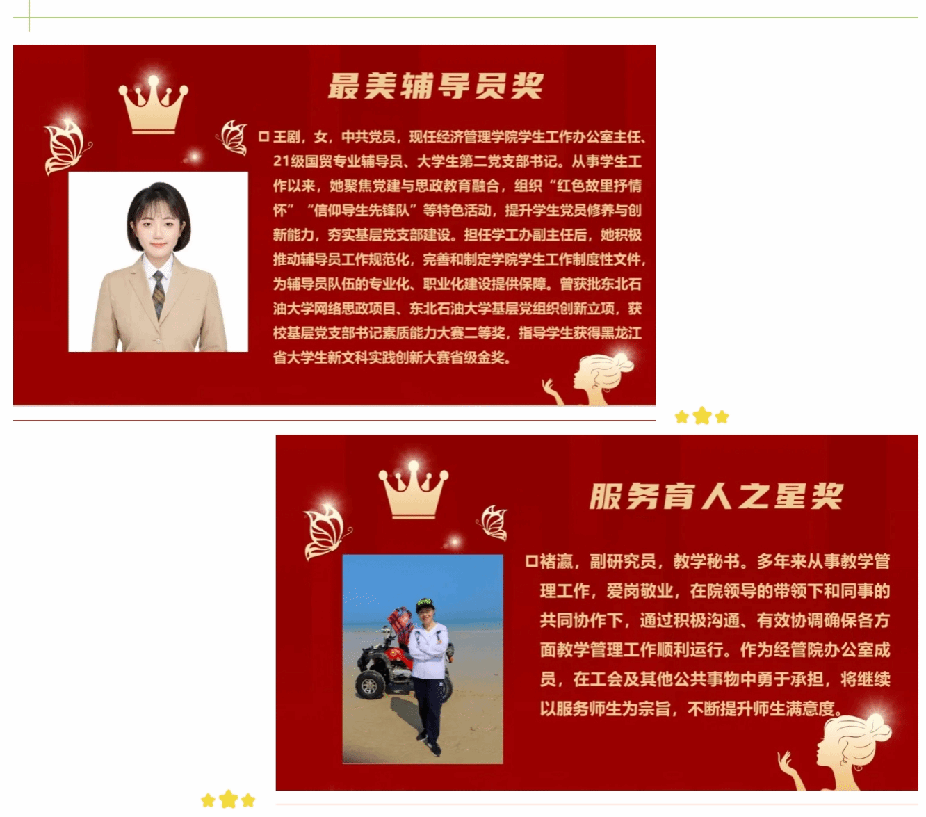 作为教辅工作人员,她们是学生心灵的守护者,用细腻的情感和无私的奉献,为学生排忧解难,帮助他们树立自信,克服困难,实现自我超越,王剧老师获得“最美辅导员奖”,褚瀛老师获得“服务育人之星奖”。