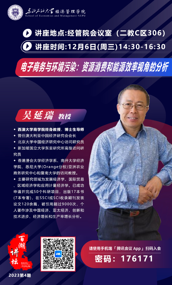 为营造浓厚的学术研究氛围,创新国际化人才培养路径,2023年12月6日14:30,bv伟德国际1946特别邀请西澳大学吴延瑞教授就“电子商务与环境污染:资源消费和能源效率视角的分析”开展学术报告。本次活动是伟德bv1946第六届国际学术交流周、百湖讲坛系列学术讲座之一,也作为推动我院国家基金申报的系列活动之一。参加此次会议的有我院师生及线上来自大庆师范学院、八一农垦大学、大庆社科联相关专家、教授和学生。报告由我院科研副院长张建华主持。