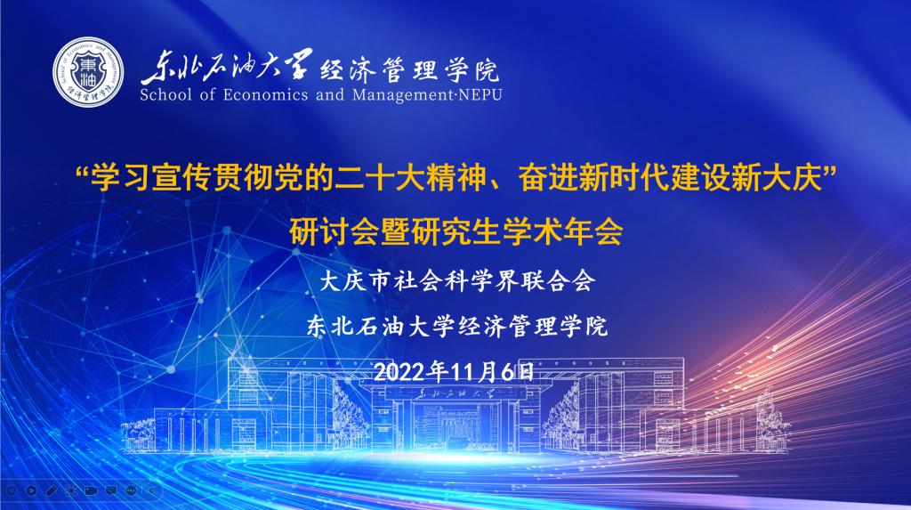 为了深入学习宣传贯彻党的二十大精神,展示驻庆高校研究生学术风采,激发创新创造潜能,激励更多驻庆高校学子留庆发展,大庆市社会科学界联合会、bv伟德国际1946和大庆市管理学会于2022年11月6日15:00线上组织开展“学习宣传贯彻党的二十大精神、奋进新时代建设新大庆”研讨会暨研究生学术年会。会议特邀大庆市社会科学界联合会主任王东、黑龙江八一农垦大学bv伟德国际1946副院长韩光鹤、大庆师范学院bv伟德国际1946行政负责人刘楠线上参会,我院领导、教师和研究生积极参会,共襄学术盛宴。会议由bv伟德国际1946副院长张建华主持。