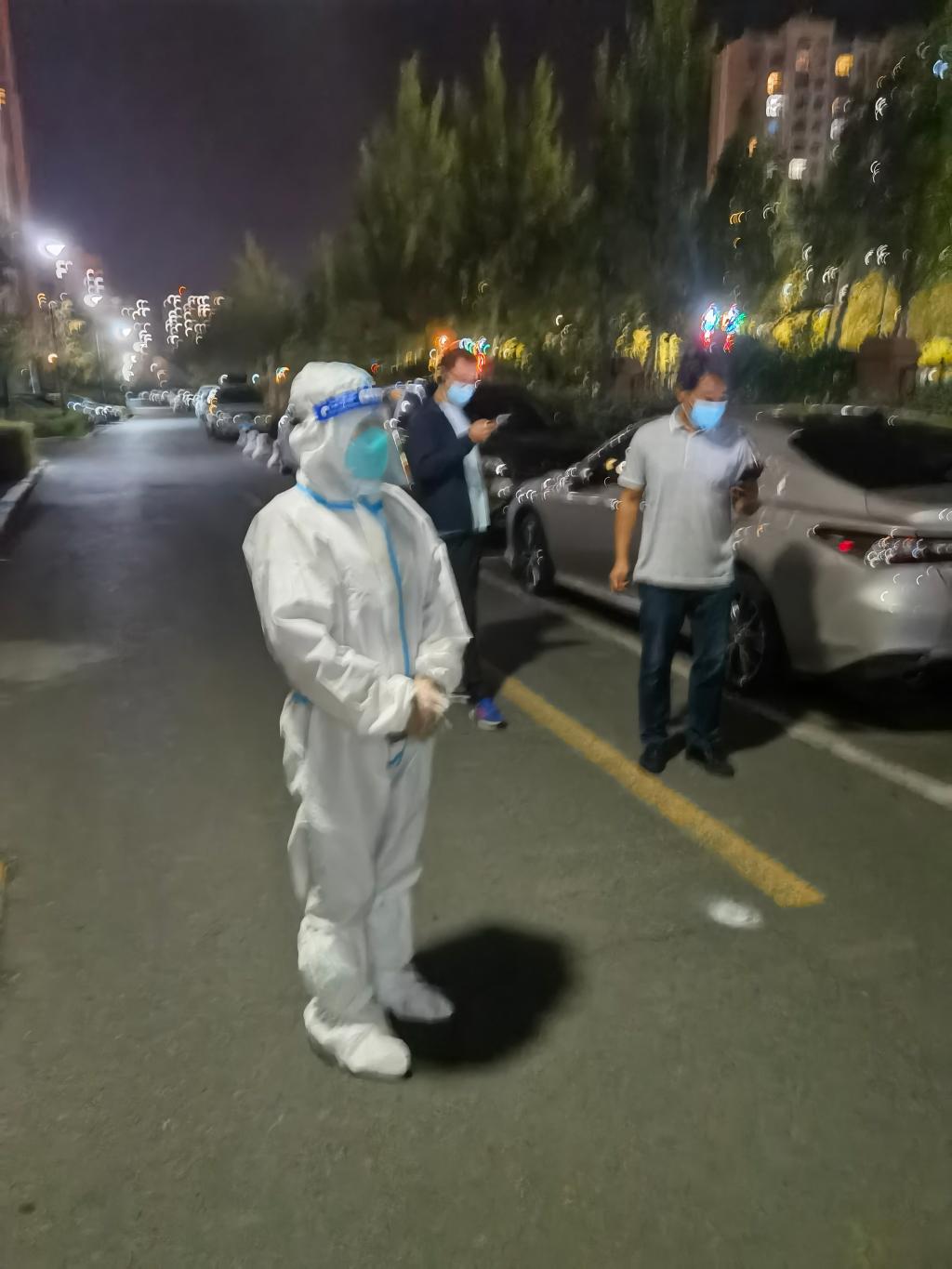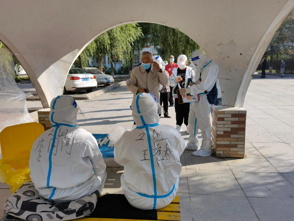 学院党委纪检委员王艳秋主动投身防疫工作,在学苑小区配合医护人员给小区居民做核酸检测。