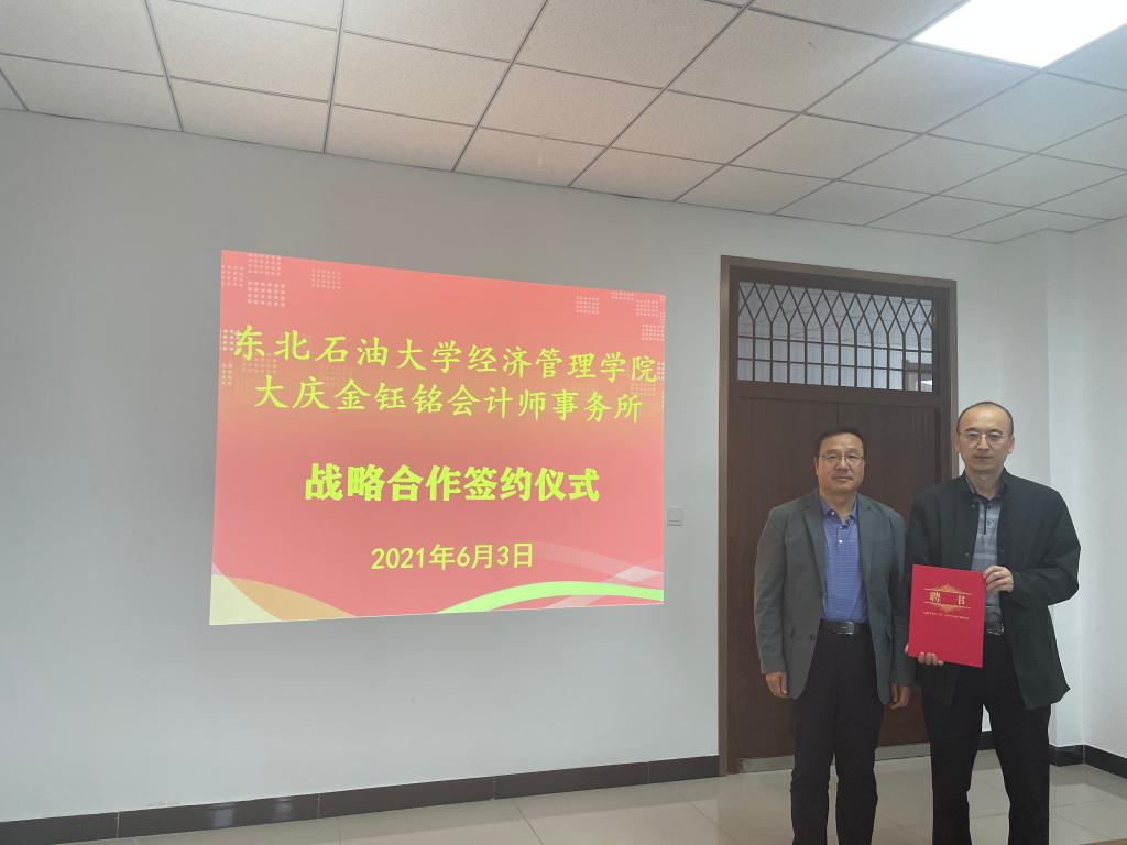 2021年6月3日下午,我院与大庆金钰铭会计师事务所的战略合作签约仪式在经管院中型会议室举行。院长赵俊平、副院长王艳秋、会计系主任生艳梅及副主任薛大维、大庆金钰铭会计师事务所所长马智、业务经理李秀月出席本次签约仪式。