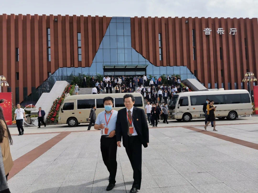 图 | bv伟德国际1946党委书记邵强、院长赵俊平与校友在音乐厅前合影