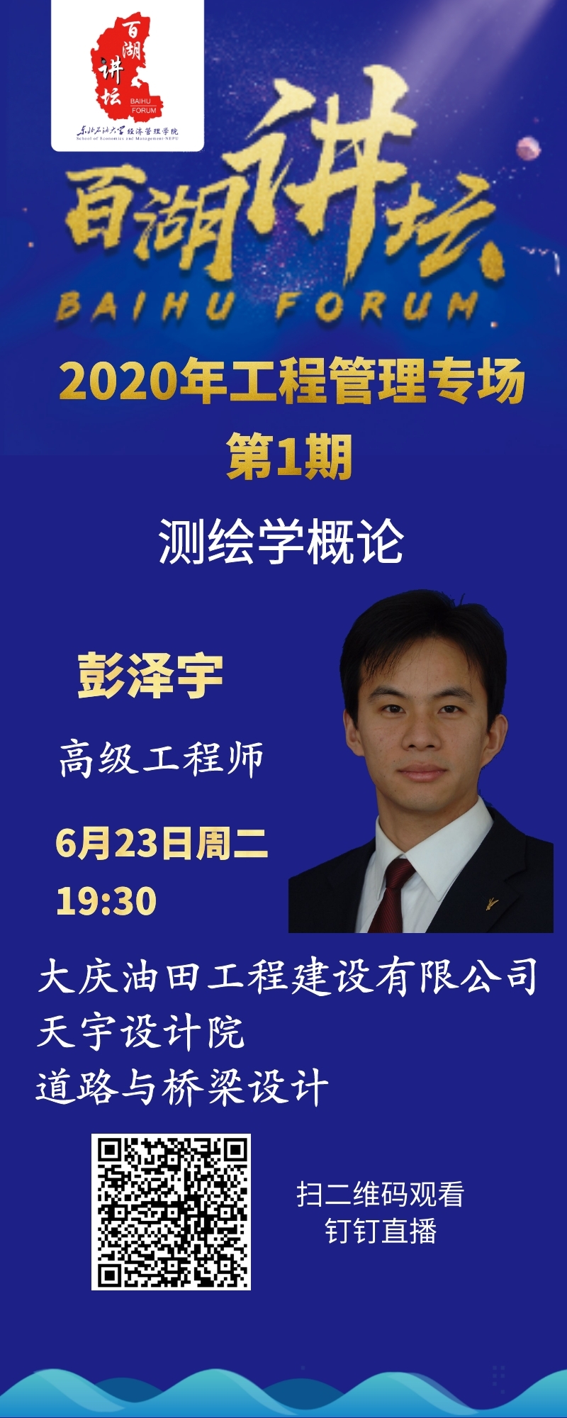 2020年6月23日晚19:30,在钉钉线上直播间,大庆油田工程建设有限公司天宇设计院的高级工程师彭泽宇专家作为2020年bv伟德国际1946百湖讲坛工程管理专场第1期主讲嘉宾,以“测绘学概论”为题,为工程管理专业教师和各年级学生带来有关测绘学知识的专题讲座,拉开工程管理专业“云实习”帷幕。讲座由bv伟德国际1946副院长林向义主持。