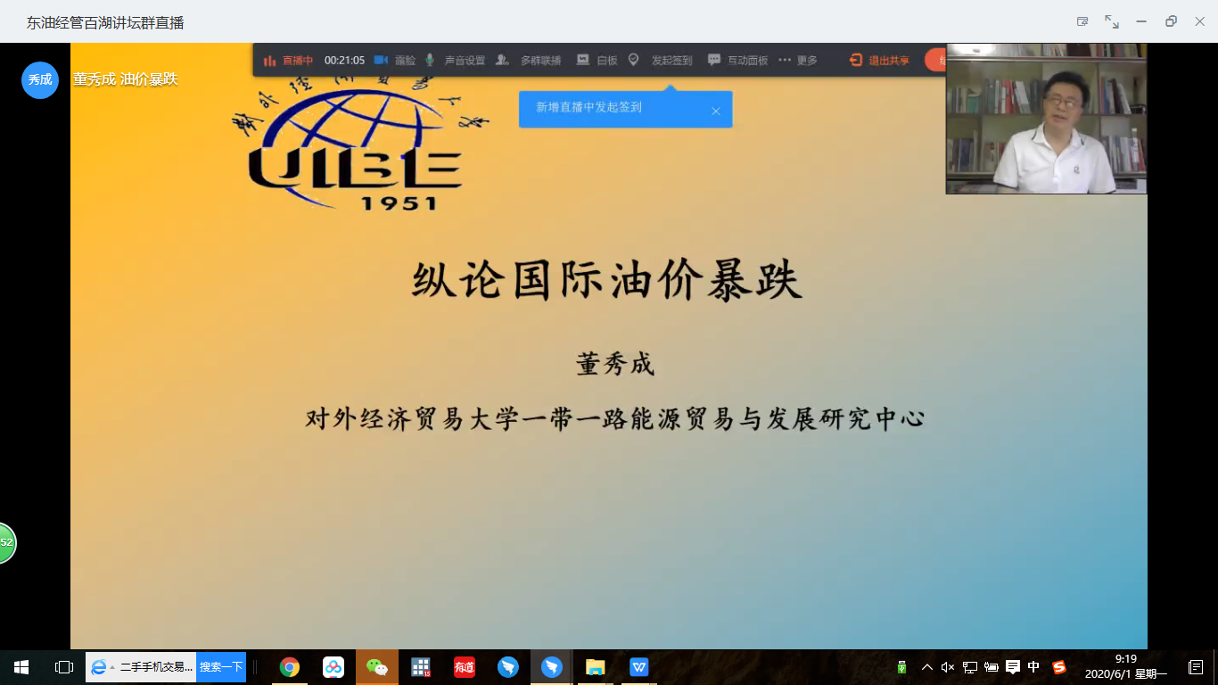2020年5月25日晚19:00-20:30,在钉钉线上直播间,对外经济贸易大学一带一路能源贸易与发展研究中心主任、中国国际低碳经济研究所执行所长董秀成教授作为2020年bv伟德国际1946百湖讲坛春季第4期主讲嘉宾,以“纵论国际油价暴跌”为题,为全校广大师生和毕业校友以及社会各界关注能源经济的朋友们带来有关国际油价暴跌背后逻辑的专题讲座。讲座由经管院院长赵俊平主持。