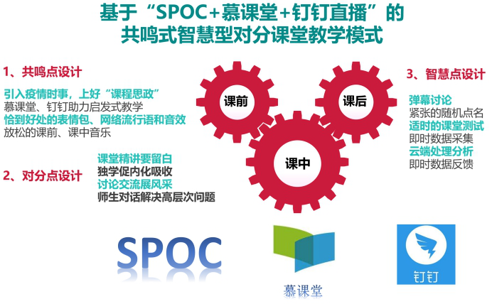 以学生为中心,理解学生学习习惯,让智能手机、网络进课堂,通过丰富的“共鸣点”、“智慧点”、“对分点”设计,融自主学习、直播互动交流、“自评+他评+师评”为一体,依托中国大学MOOC平台、钉钉平台即时数据采集、云端处理分析和即时数据结果反馈,成功构建完整的共鸣式智慧型对分课堂教学生态体系,打造轻量化智慧教学模式。