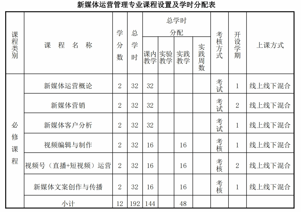 以“新媒体运营”为核心,主要设置下列核心课程:新媒体运营概论、 新媒体营销、新媒体客户分析、 视频编辑与制作、视频号(直播+短视频)运营、新媒体文案创作与传播等课程。
