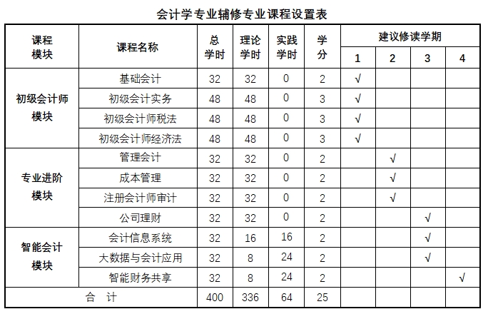 针对会计学辅修专业,课程精心设置初级会计师模块、专业进阶模块、智能会计模块三个模块。初级会计师模块精准聚焦全国初级会计师资格考试;专业进阶模块注重财会理论提高;智能模块紧跟时代智能大数据发展。