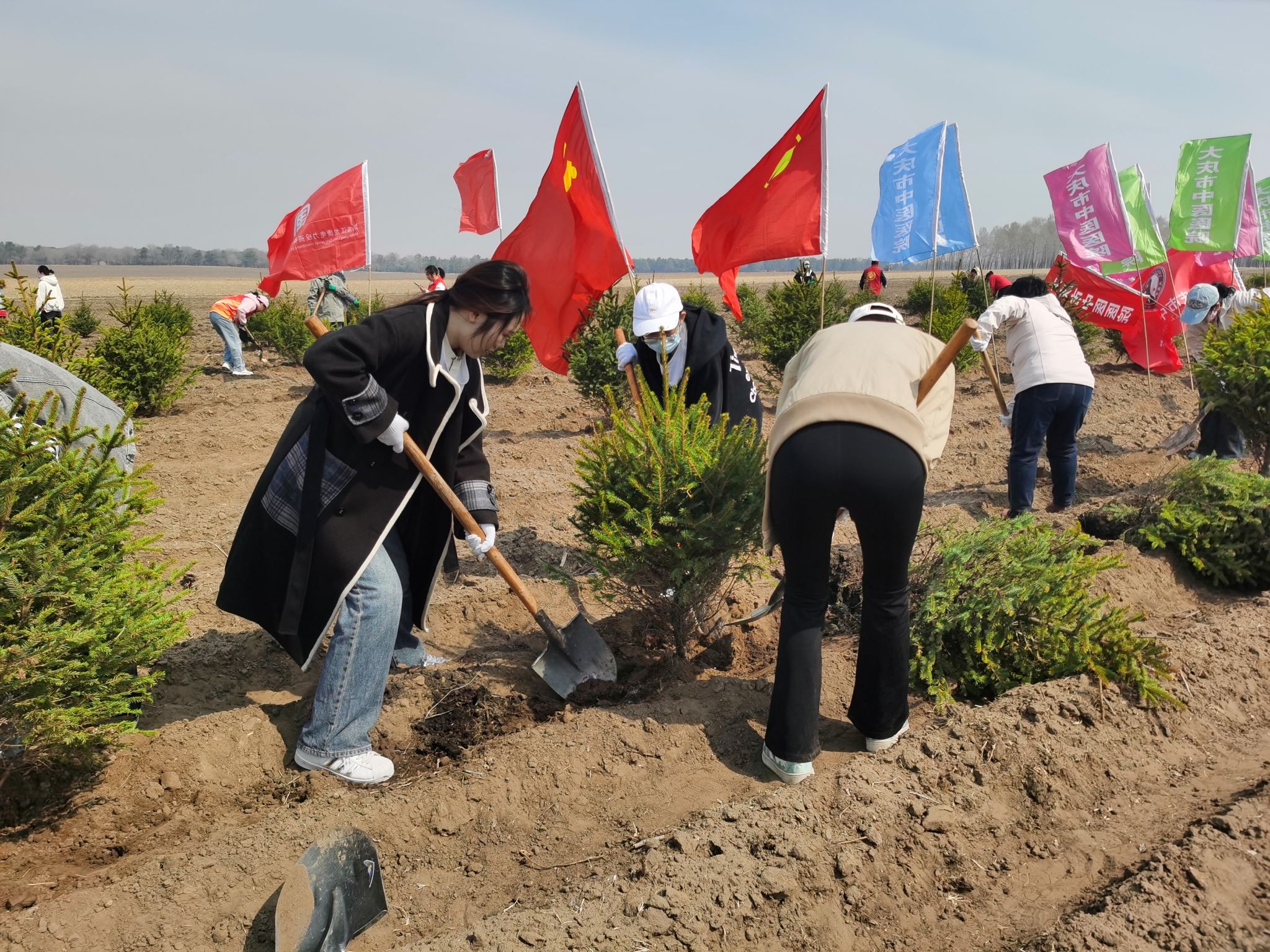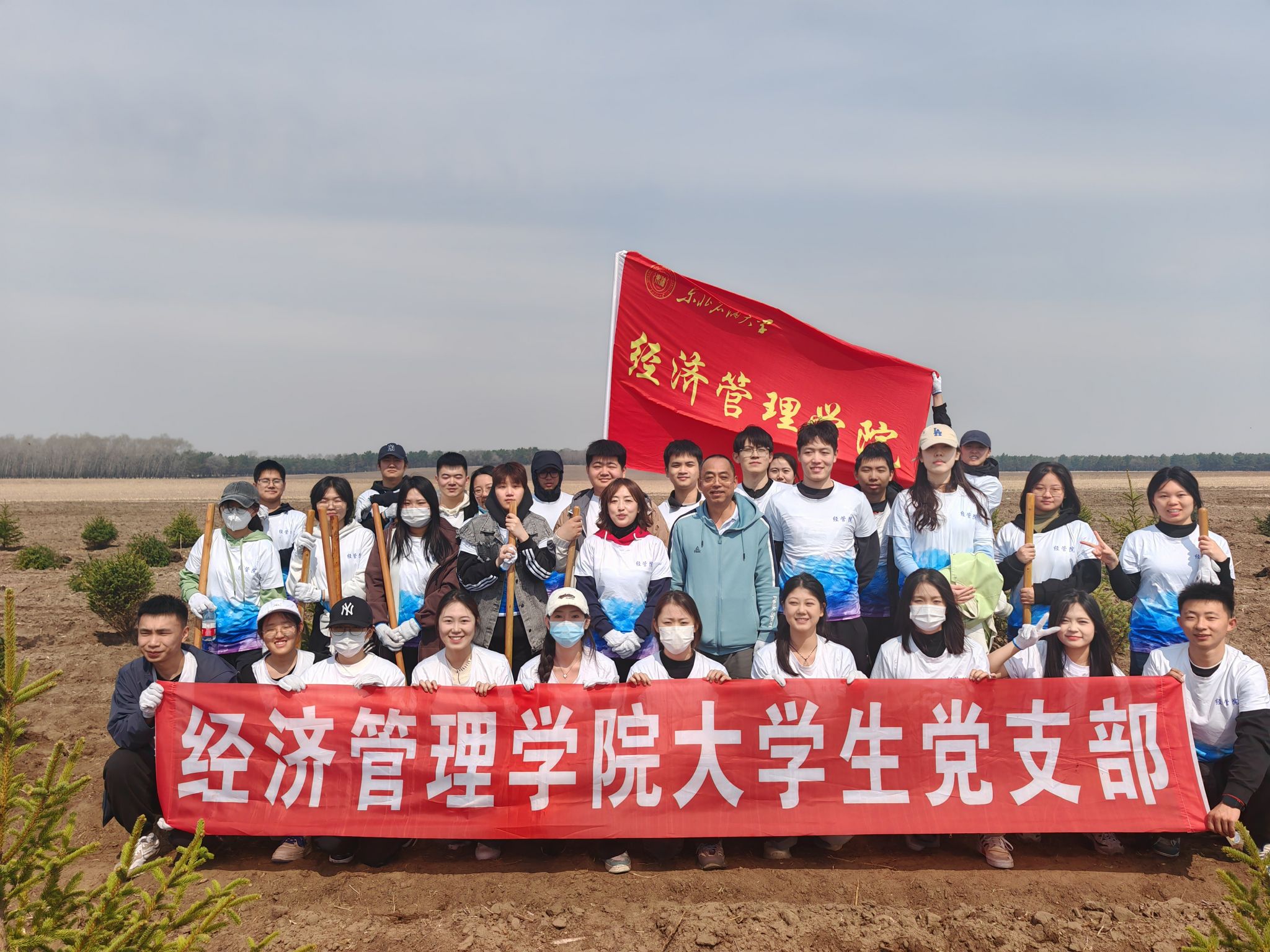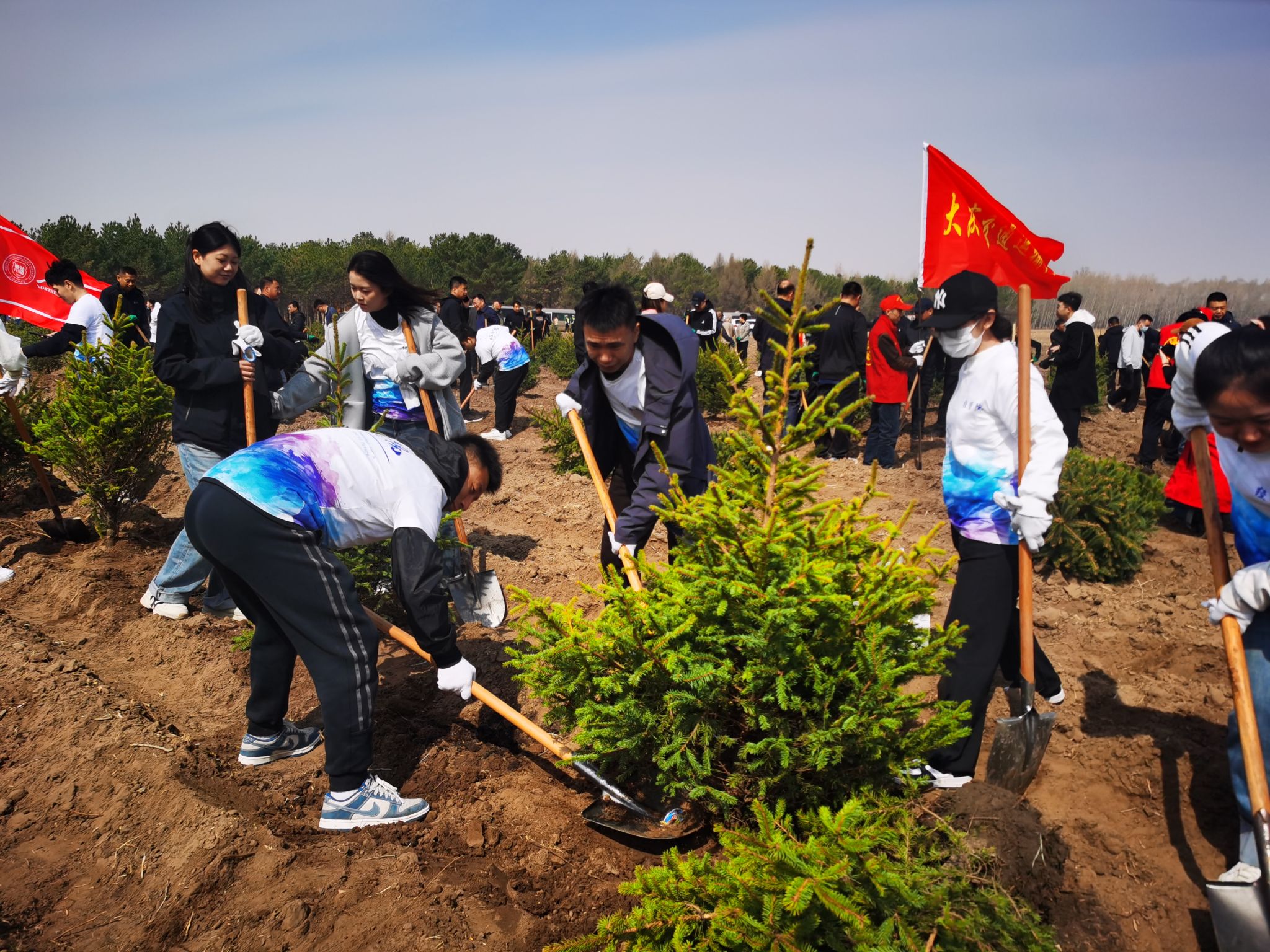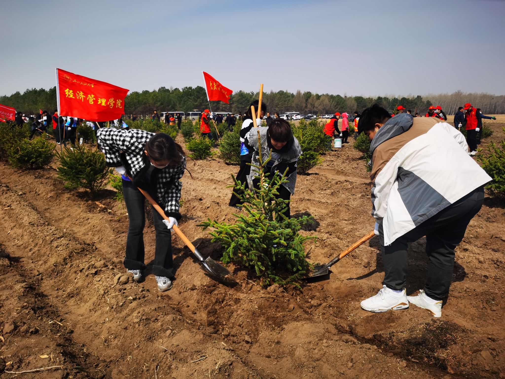 在植树过程中,大家热情高涨、充满干劲,认真学习种树的流程和方法后,分工合作、相互配合,扶苗栽树、围堰填土,种下一颗又一颗松树。大学生是国家未来发展的中坚力量,要积极参加劳动、植树造林,把绿色的种子种进心里,养成尊重自然、热爱自然的意识,人人争当绿色使者、生态先锋。