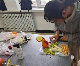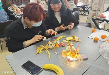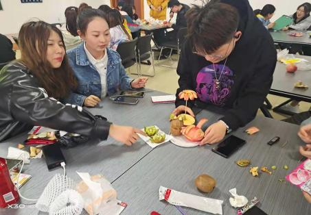 秉持“公平竞争、开拓创新”的精神,主持人宣布本次比赛规则,比赛时间为1小时,同学们自行分组,每组组长为本次比赛的评委。参赛选手根据自己所选水果进行构思、雕刻和拼接,然后给作品命名并介绍作品的创意灵感。大家都热情四溢,虽然时间、空间和资源都有限,但也无法限制活动现场这群年轻人的发散思维,活动过程显现出了我院学生热爱生活、热衷创新的卓越品质。