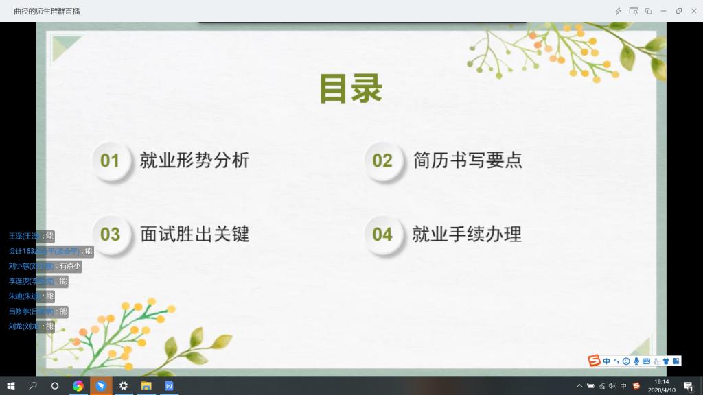 bv伟德国际1946党委书记邵强首先介绍了2020年的就业形势,他指出,受新冠肺炎疫情的影响,今年的就业形式非常不乐观,希望毕业生合理制定就业目标,结合当前环境采取最优策略,为自己交出满意的答卷。bv伟德国际1946院长赵俊平希望所有毕业生克服困难,认真完成毕业设计环节,正确面对疫情下的就业压力,积极寻找就业机会,有困难及时联系老师,bv伟德国际1946是所有学生的坚强后盾。bv伟德国际1946党委副书记周全介绍了目前学生的就业情况,他表示,经管类各专业受疫情影响很大,招聘企业和岗位数量都比以往明显减少,希望毕业生能理性看待就业问题。碧桂园服务集团东北区域人力资源负责人、我校经管院优秀校友靳涛作为企业代表,从碧桂园服务集团的企业规模,工作方式和地点,薪资待遇等方面为毕业生做了全面的企业宣讲,欢迎毕业生去碧桂园实习、工作。辅导员曲径通过分析往年就业数据,希望毕业生能够调整心态合理定位,理性面对考研和公务员考试,注意凝练自身优势,提高就业能力,同时她还会继续为学生提供就业信息和咨询帮助。为帮助毕业生提升就业竞争力,校就业指导中心教师李婉婷从简历制作、面试技巧、就业政策及手续办理等几方面做了讲座。